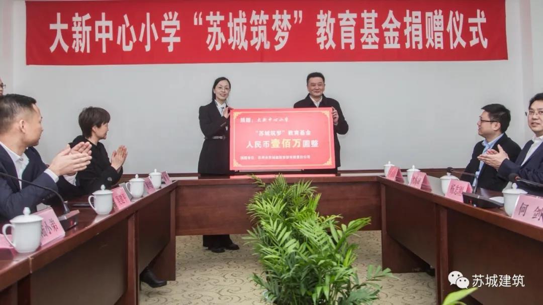 2月26日上午,蘇州市蘇城建筑安裝工程有限公司向大新中心小學捐贈100萬元,設立“蘇城筑夢”教育基金,捐贈儀式于張家港大新中心小學杏樓二層接待室舉行。